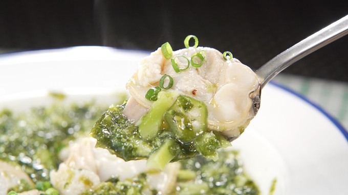 - ハマグリの口が開いたらハマグリだけを取り出し、オクラとあおさ海苔を加える。