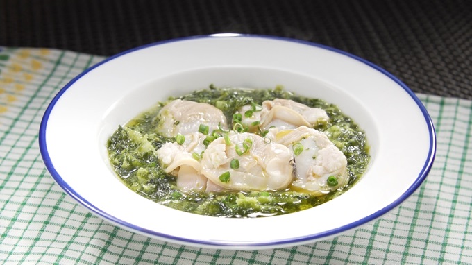 塩とオリーブオイルを入れ、ブロッコリーを軽く潰しながらよく混ぜ合わせる。 - 器に盛り、殻から外しておいたハマグリを中央にのせ、