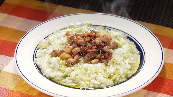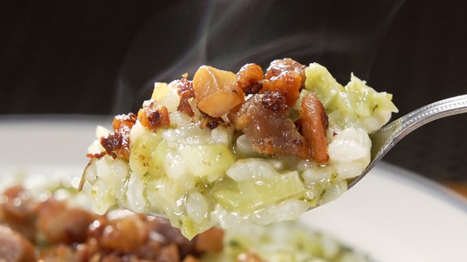 ローズマリーを加えて鶏もも肉がカリカリになるまで炒める。 - 炊きがったリゾットにパルメザンチーズと塩を加えて味を調え、器に盛る。