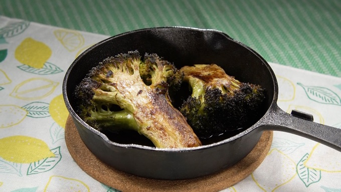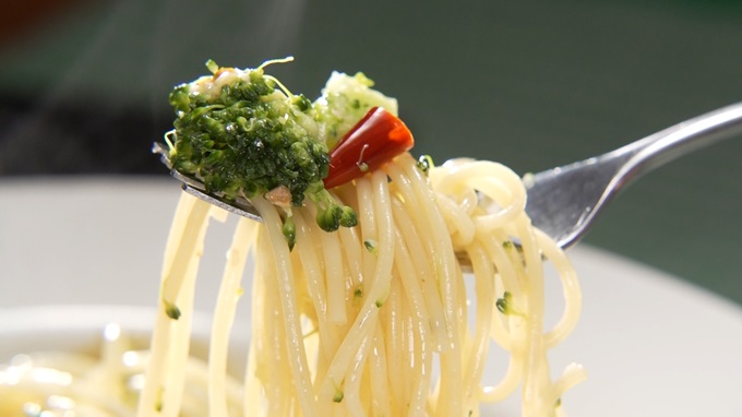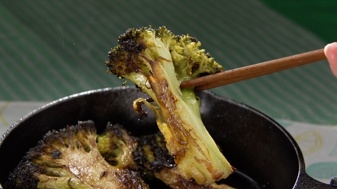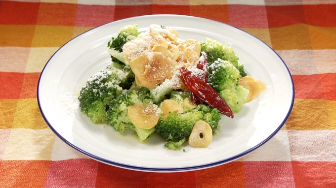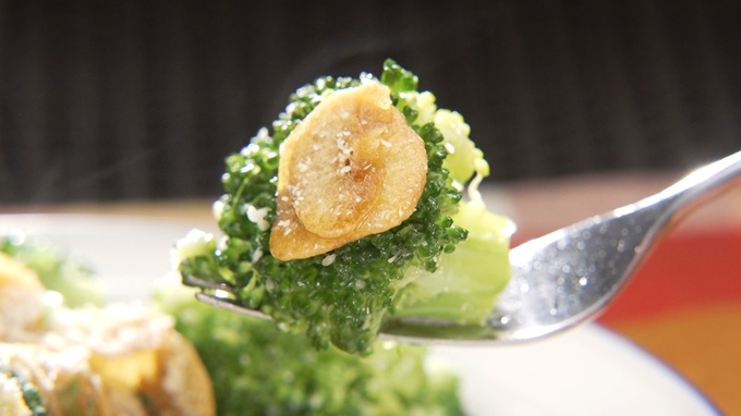 5~6分ほどかけて炒め、にんにくのふちが薄いキツネ色になったら取り出す。 - ブロッコリーを1分程塩茹でし、水気を切ってフライパンに加える。