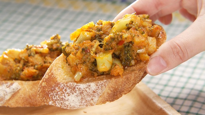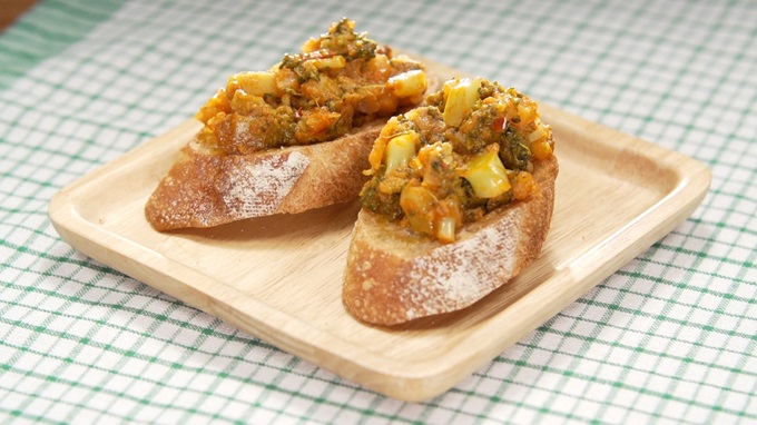 - 幅2cmに切り、軽く焼いたバゲットの表面ににんにくを擦り付け、塩を振る。