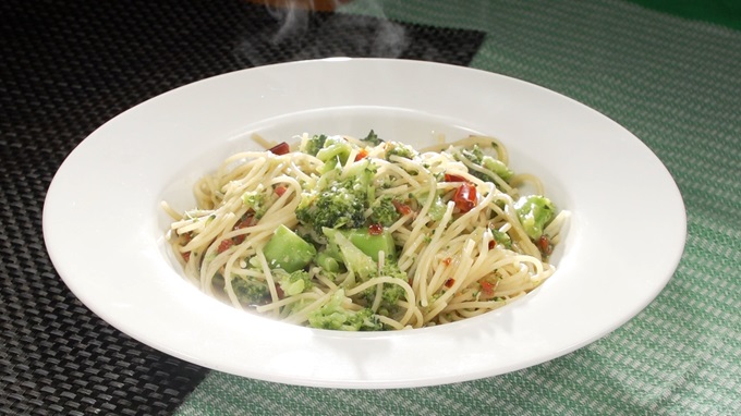 ブロッコリーとパスタが茹であがる1分位前にドライトマトを入れる。 - パスタがアルデンテに茹であがったらブロッコリーとパスタを【3】に入れ、