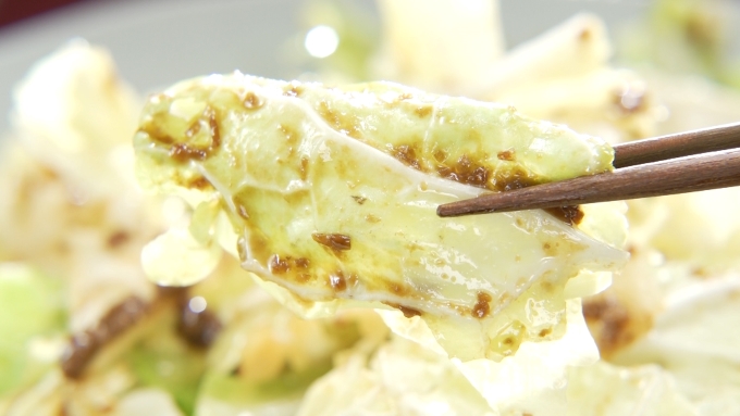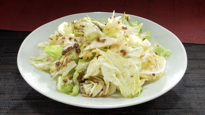 残りのしょう油(大さじ1/3)を入れて炒める。 - 皿に盛り付け、ちぎった焼きのり(1枚)をかける。