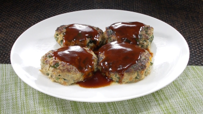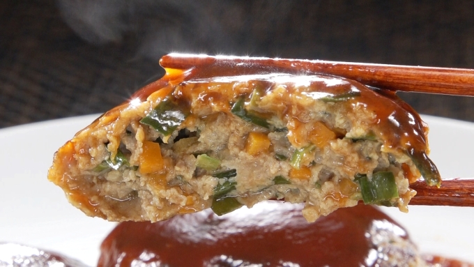 玉ねぎをサラダ油(分量外・少々)で炒め、粗熱をとっておく。パン粉を牛乳に浸しておく。 - 合い挽き肉にニラ、炒めた玉ねぎ、にんじん、卵、