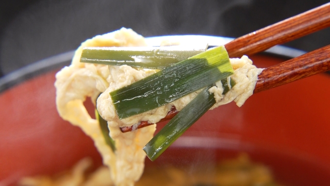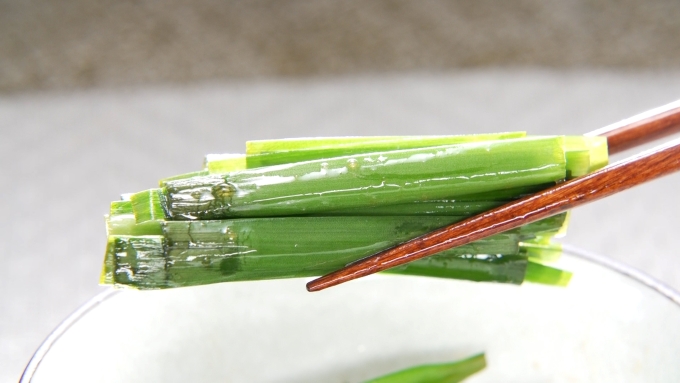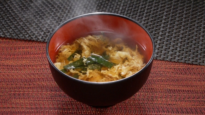 - かつお出汁を温めて味噌を溶き、ニラを加える。