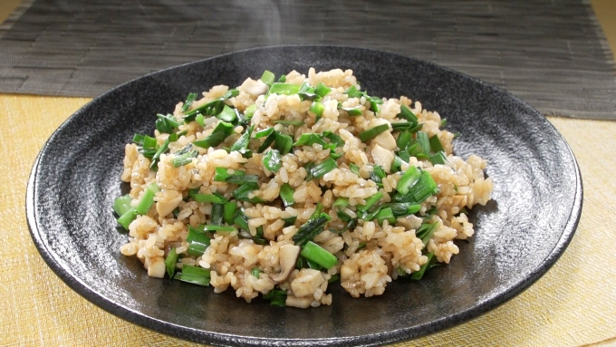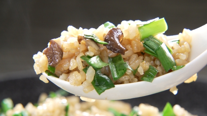 - エリンギに火が通ったらごはんを加えてさらに炒め、塩、コショウ、しょう油で味を調える。