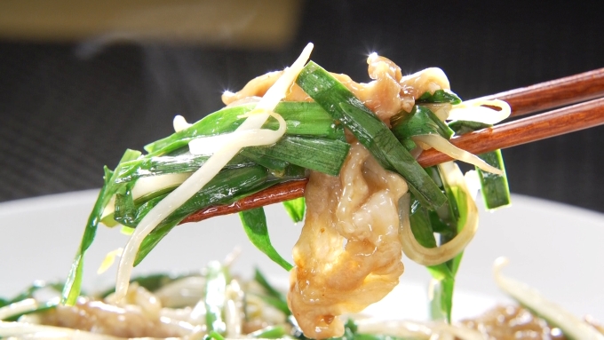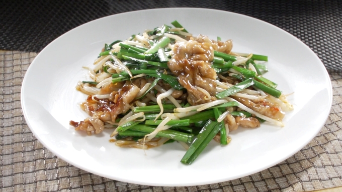 豚肉の色が変わってきたらもやし、ニラを入れてその都度さっと炒める。 - 合わせ調味料を入れ、全体に絡める。