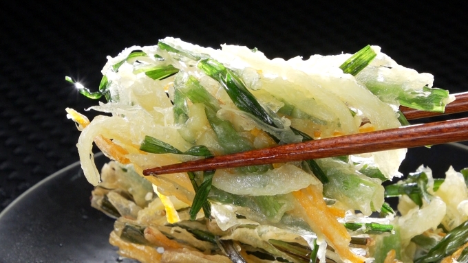 - 天ぷら粉に塩を入れて泡立て器で混ぜ、水を加えて衣を作る。