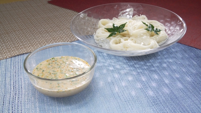 - めんつゆ、白すりゴマ、青ネギ、ラー油を加え、混ぜ合わせる。