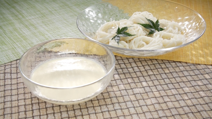 - 白ねりゴマに豆乳を少しずつ入れ、溶きのばす。