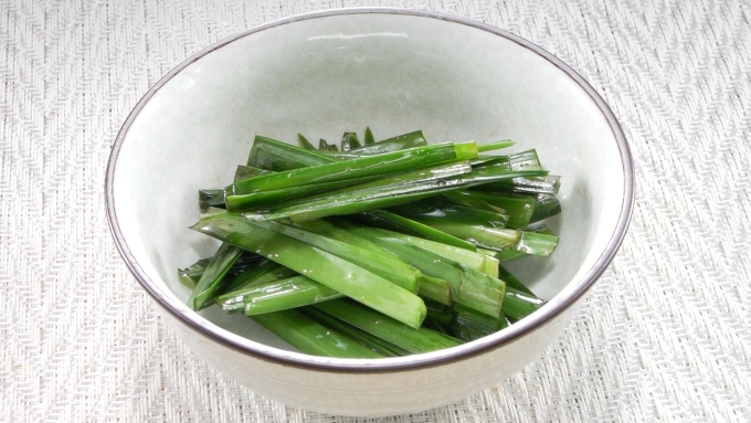 - ニラは根元を5mm、葉先を1cm幅に刻む。