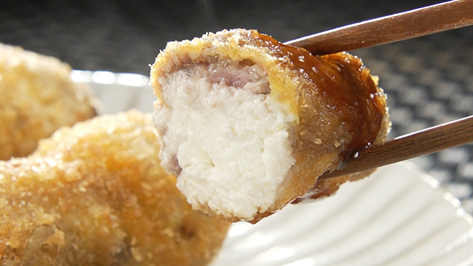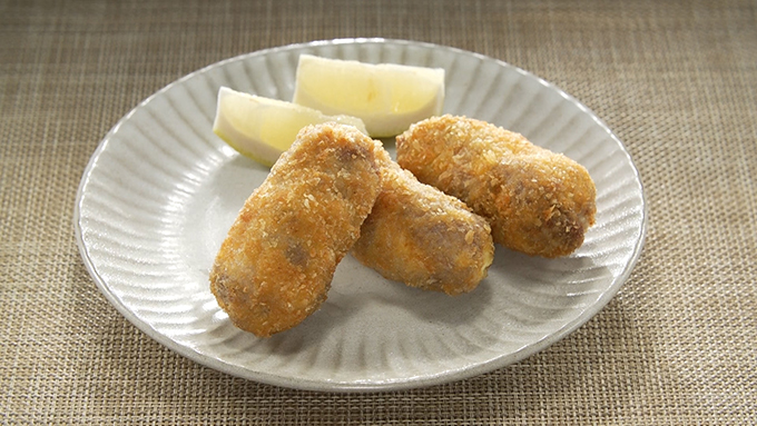 小麦粉、溶き卵、パン粉をつけ、160℃に温めた油できつね色になるまで揚げる。