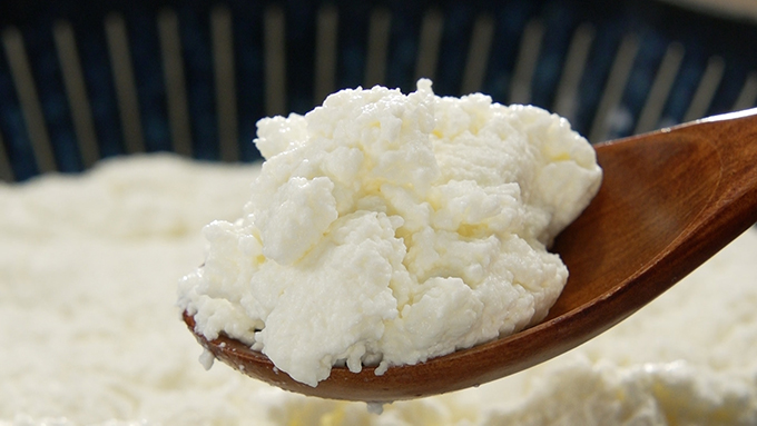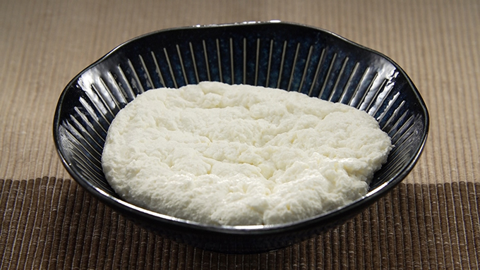 ふつふつとしたら火を弱め、ヘラで牛乳を混ぜてから酢を入れる。 - 水分と牛乳豆腐に分離したら火を止め、キッチンペーパーを敷いたザルにあけて水気を切る。