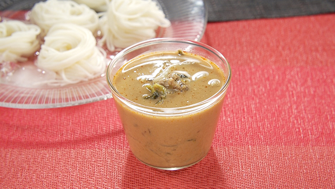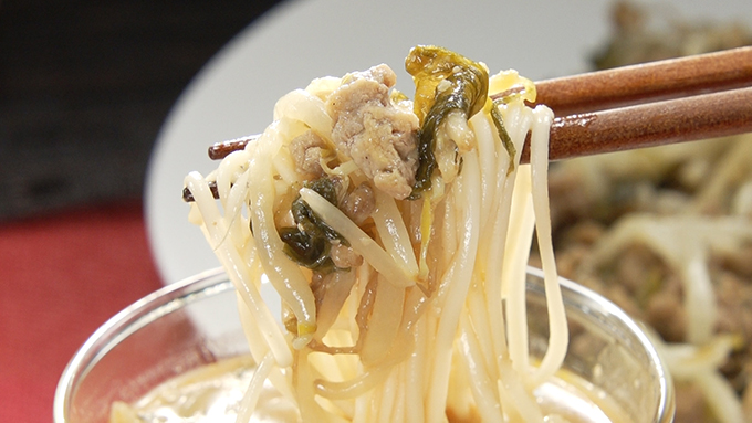 鶏がらスープの素、砂糖、しょう油、コショウを加えて味を調え、皿に盛る。 - しょう油、すりごま、きな粉、酢、味噌、豆乳、水、ラー油を入れてよく混ぜる。