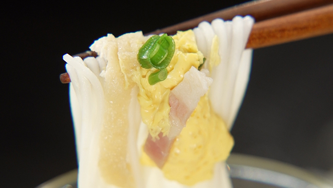 - 鍋に白だし、水、薄口しょう油、みりん、しょう油、油揚げ、ベーコンを入れて煮立たせる。