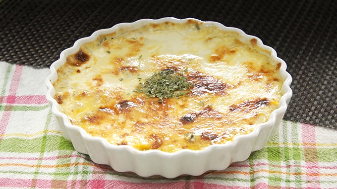 - かぼちゃを耐熱皿に並べてフォークで優しくつぶし、【3】のソースを注ぐ。