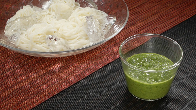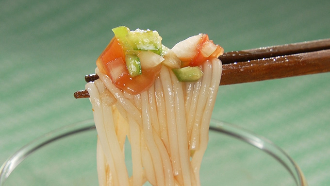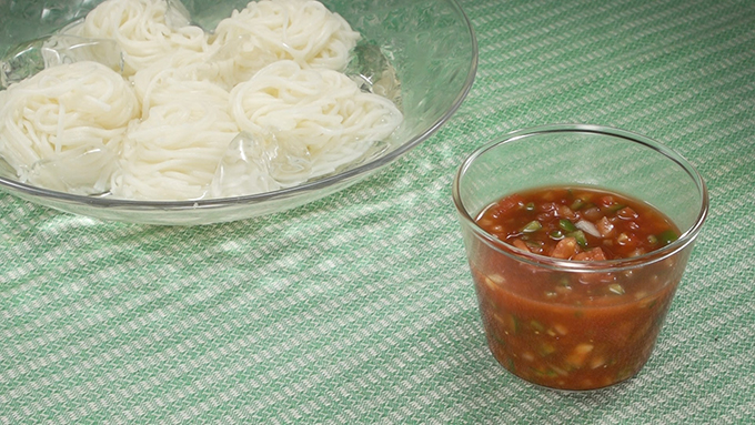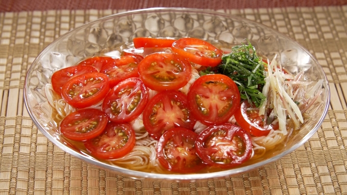 しょう油、酢、砂糖を加えてめんつゆを作り、氷水で冷やす。 - 中玉トマトは薄切りにし、みょうがはできるだけ細い千切り、大葉は千切りにする。