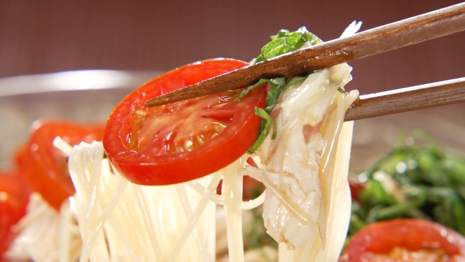 ゆで鶏は手で細かく裂く。 - 素麺を表示通りに茹で、冷水でよく洗って氷水でしめる。水気をよく切る。