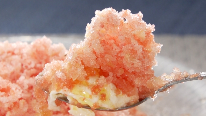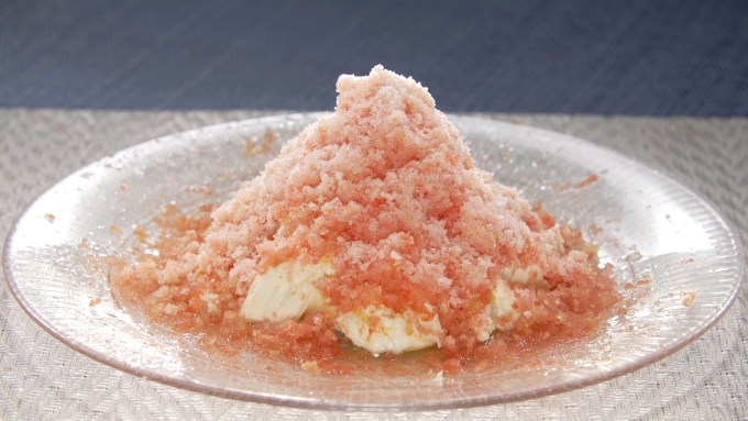 塩、オリーブオイルをかける。 - 【2】に冷凍したトマトを山盛りに削りかける。
