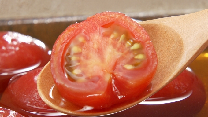 - 中玉トマトはヘタをくり抜き、先端に浅く切り込みを入れる。