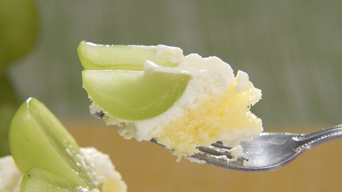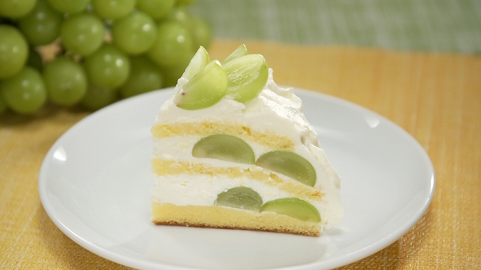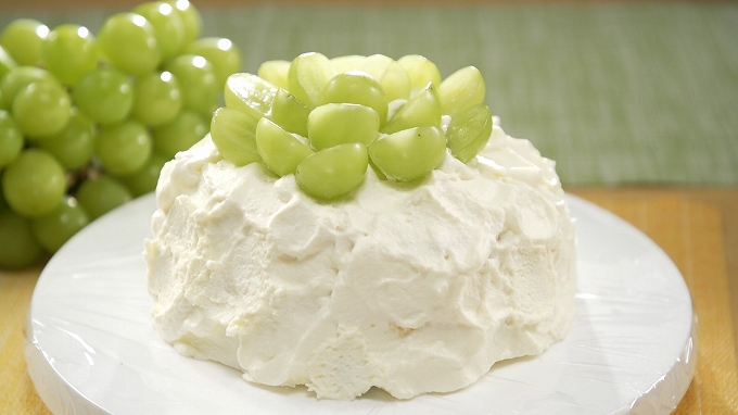 ホイップクリームを全体に塗り、シャインマスカットを飾る。