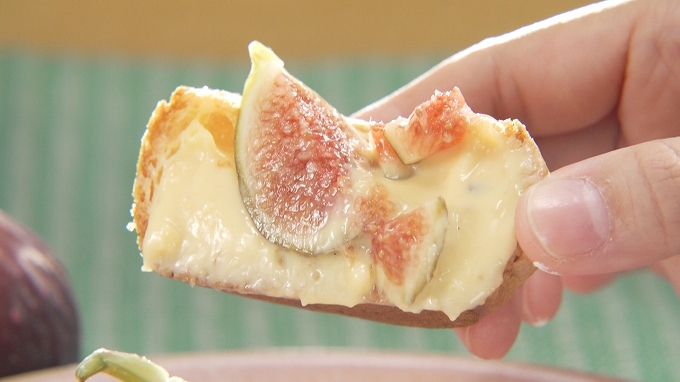 - 焼けて熱が取れたシュー生地の上を切り、イチジク入りカスタードクリームを絞る。