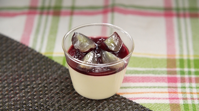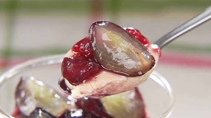 赤ワインを入れて軽く水分を飛ばすように煮詰め、冷やす。 - 固まったババロアにブドウのジャムをのせ、ブドウを飾る。