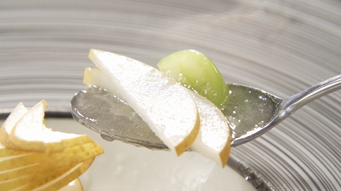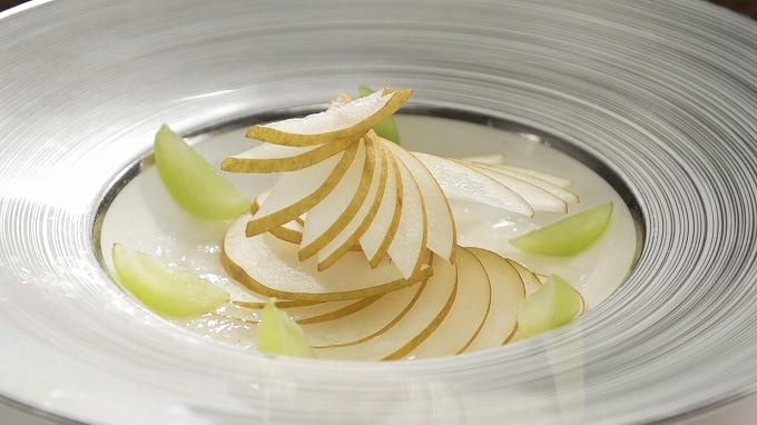 切った梨の軸を決めて扇状にずらし、皿に盛る - 固まったジュレを崩して梨の周りに盛り、シャインマスカットを飾る。