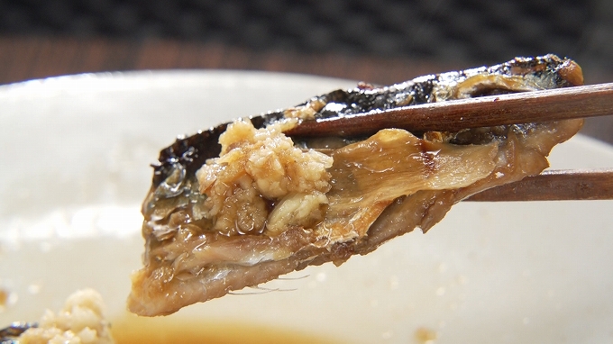 薄切り生姜も入れ、一緒に焼く。 - 焼き目がついたらつけ汁とおろし生姜を加え、さっと煮る。