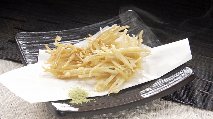 - 180℃に温めた油でからりとするまで揚げ、器に盛って抹茶塩を添える。