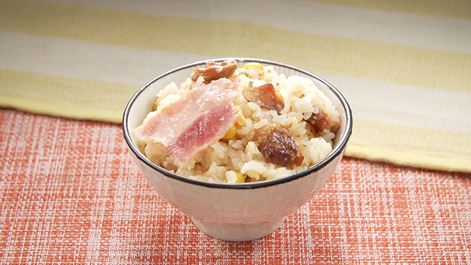 - 炊飯器の釜に浸水して水気をきった米と水、スイートコーン、焼き鳥の缶詰を入れる。