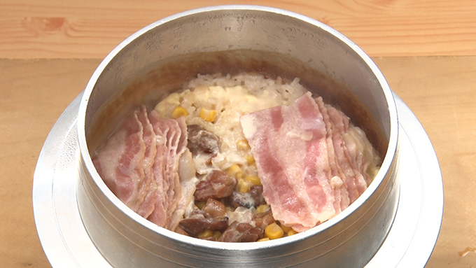マヨネーズを入れ(チューブのままならばおよそ3周)、ベーコンを並べる。 - ホワイトソースをかけ、氷をのせて炊く。