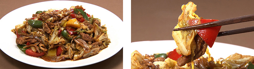 - キャベツ、ピーマン、ネギを加えて炒め、酒を加えてさらに炒める