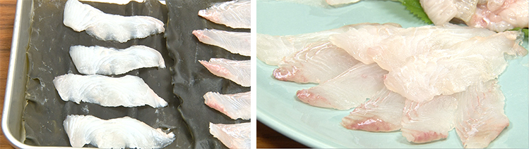 【作り方】- ヒラメを6~7mm幅(薄造りよりは厚め)に切る