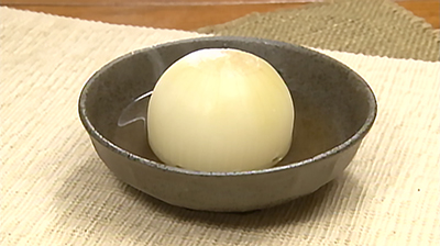 温めたコンソメスープに玉ねぎをまるごと入れる