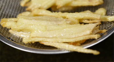 - 切った新生姜に小麦粉をまぶし、衣を合わせ、しゃもじ等を使い170℃の油に落としていく。
