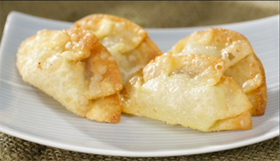 - 餃子の皮にチーズ、炒めた生姜を包み、180℃の油で揚げる。