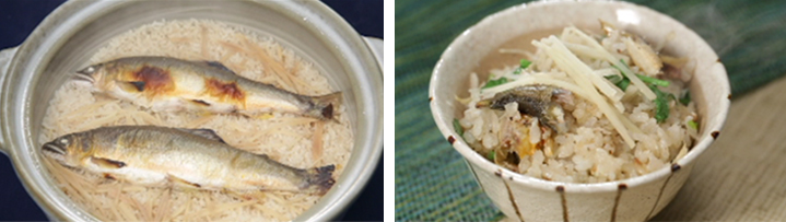 - 鮎と生姜をお米の上に乗せ沸騰してから15分炊き、火を止め10分蒸らす。