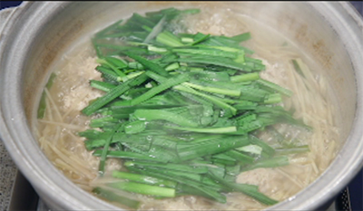 - 温めたかつおだしにスプーンで鶏つくねを作り入れ、ニラと生姜を入れ、火が通れば完成。