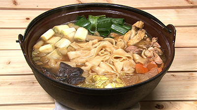 材料(4人分) 分量 ・ ほうとう(生めん) …300g ・ 深谷ねぎ …2本 ・ 白菜 …2枚 ・ 大根 …200g(約8cm) ・ ニンジン …1/2個 ・ 干し椎茸 …4枚 ・ 鶏肉 …150g ・ 油揚げ …1枚 ・ 醤油 …大さじ4~5 ・ 丸系八つ頭 …150g(約1/2個) ・ かつお昆布だし …1600ml ・ 七味唐辛子 …適量 ・ ゆずの皮 …適量