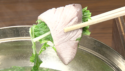 - 水菜、寒ブリをしゃぶしゃぶし、水菜をブリで巻くようにして