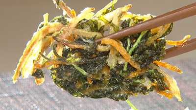 材料(4人分) 分量 ・ 生海苔 …40g ・ 玉ねぎ …60g ・ 人参 …40g ・ 三つ葉 …10g ・ 薄力粉 …大さじ1 ・ 冷水 …60ml ・ 衣用薄力粉 …大さじ2