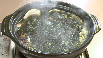 蓋をしてから貝の口が開くまで蒸し、蒸し汁ごとかつおだしの入った土鍋に入れる。 - 調味料をすべて加え、白菜、シイタケ、豆腐、スズキの順に煮る。
