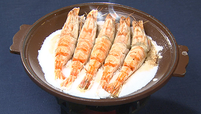 【作り方】- 陶板に塩を敷き、モサエビを乗せ