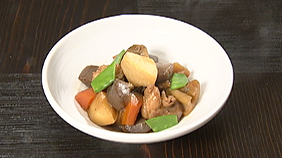 材料 分量 ・ 人参 …80g ・ 牛蒡 …100g ・ レンコン …100g ・ 戻した筍 …100g ・ 干し椎茸 …4枚 ・ こんにゃく …1/2丁 ・ 里芋 …100g ・ 鶏もも肉 …200g ・ 絹さや …適量 ・ 鰹出汁 …500㏄ ・ 干し椎茸戻し汁 …200㏄ ・ 酒 …60㏄ ・ みりん …60㏄ ・ 濃口醤油 …40㏄ ・ たまり醤油 …10㏄ ・ 砂糖 …40g ・ ごま油 …適量