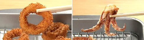 小麦粉、卵、パン粉の順につけ、170~180度の油で揚げる。 - <ゲソの竜田揚げ>