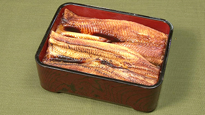 - 重箱に入ったごはんの上に飯ダレをかけ、刻んだシソ、ノリを散らし、2枚のアナゴを乗せてタレを塗る。