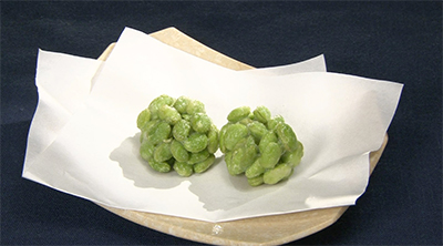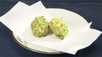 - 小麦粉、きなこ、卵白をつけて、たたいた枝豆をまぶす。