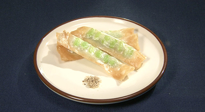 - 8等分に切った春巻の皮に枝豆を6粒並べて巻き、糊で止める。