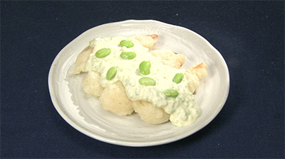 材料(4人分) 分量 ・ 枝豆(正味)【裏ごし用】 …50g 【飾り用】 …8粒 ・ むきエビ …8尾 ★ マヨネーズ …90g ★ 塩 …小さじ1/4 ★ コンデンスミルク …大さじ1/2 ★ エバミルク …大さじ1/2 ★ レモン汁 …小さじ1/2 <衣> ・ 薄力粉 …90g ・ 浮粉 …7g ・ ベーキングパウダー …7g ・ 片栗粉 …7g ・ 水 …110g